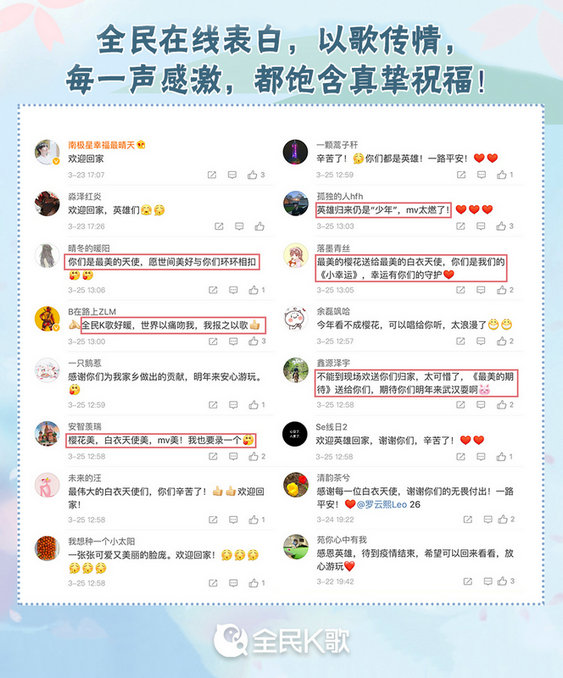 此次“把樱花唱给你听”活动,全民K歌充分发挥自身号召力,将亿万用户的声音汇聚在一起,向抗疫英雄们送上无限感激和祝福。作为国民音乐娱乐社交平台,全民K歌将持续积极肩负社会责任,以歌声传递正能量,点亮希望。