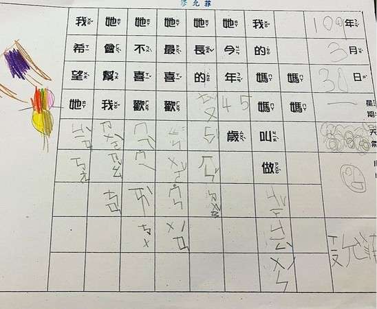 4岁咘咘用刚学习的注音符号,一笔一画歪歪扭扭写出自己心中的妈妈,包括“头发很短”、“最喜欢跟我们玩”、“不喜欢妹妹爱哭”、“会帮我做早餐”等等。贾静雯特别注意到咘咘写出妈妈今年45岁,笑道:“我一直跟咘咘说我才30岁……结果……真实年龄被曝光了。”