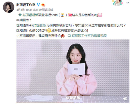 人气超高的赵丽颖结婚生子一气呵成,产后更是除了拍戏鲜少露面,令粉丝牵挂不已。随着近日明星们纷纷复工,赵丽颖工作室也上传了一段颖宝的采访视频积极营业。视频中,赵丽颖身穿粉色帽衫长卷发披肩,全程小表情不断娇俏可人,笑容依然甜美少女感不减。颖宝在视频中分享了自己的近况,她表示疫情居家期间,自己在家的主要娱乐活动是看电影补剧,偶尔还会练习厨艺,贤妻良母范十足。
