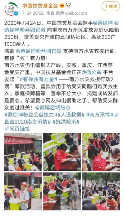 赤子之心,热忱炽热。如今,蔡徐坤积极承担社会责任,正成长为国家年轻力量的重要担当。出道的这两年多以来,他先后于2018年芭莎慈善夜捐款60万元;为贫困地区儿童捐赠了11所图书室;第一时间为四川宜宾地震灾害捐款10万;台风利奇马登,继续捐款300万……据统计,蔡徐坤从2018年出道至今,公益捐款已有374万余元,这其中不包括无法按具体金额计量的油粮物资捐赠。
