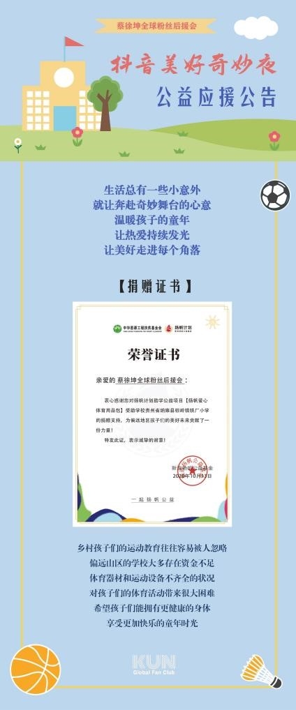 蔡徐坤从未以偶像自居,但他却通过自己在承担社会责任道路上的身先示范影响着更多的人,这其中就包括他的粉丝。截至2020年10月,蔡徐坤成立的“葵计划爱心基金”筹款已超过264万元,近27万人次参与捐赠。2020年5月,“葵计划”爱心基金为湖南省三所中学援建3间图书室,共计45万元。其中,每间图书室配备8000册图书,6个双面铁质书架、20套桌椅等设施。2020年7月,南方大水,蔡徐坤粉丝团向重庆市万州区发放家庭保障箱250份,覆盖受灾严重的五间桥社区,惠及250户1500余人。2020年9月,蔡徐坤粉丝后援会发起“为爱黔行之大山里的教育”公益活动,帮助更多欠发达地区的孩子可以学习到音乐知识,为他们日后发展创造更多可能,粉丝们积极参与,共募集到音乐教室7间,智慧教室4间……