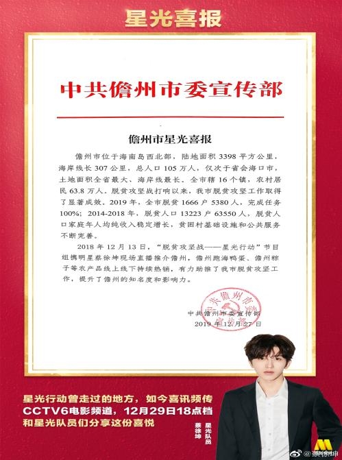 在10月3日的央视一套节目中,蔡徐坤跟随央视心连心艺术团来到湖南十八洞村,深入精准扶贫首倡地,感受乡村振兴的崭新风貌,为脱贫攻坚加油。