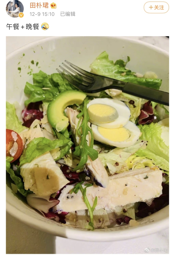 然而这只是她减肥之路的冰山一角,她又晒出一天的午饭晚饭只吃一份沙拉。这可能对于大部分人,只是一顿的饭量。