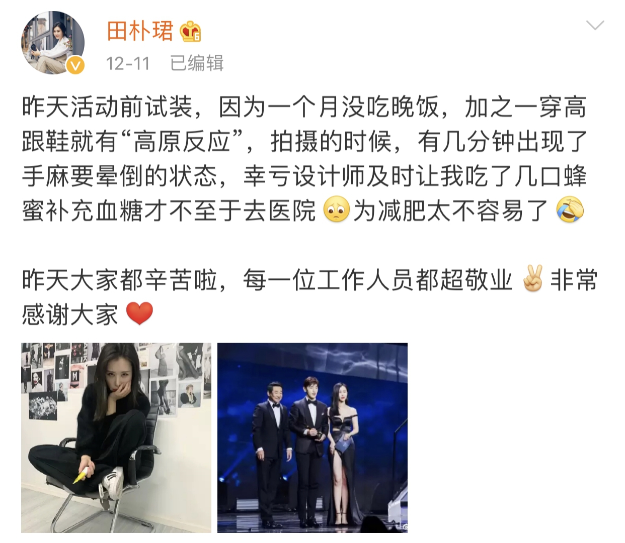 在控制饮食的同时,又每天配合着高强度的健身训练,真的是很拼。然而在参加活动之后,就曾因为这一个月以来的高强度减肥,出现了低血糖的状态,让人心疼。