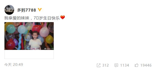 12月20日,孙莉在微博分享了一张多妹的照片为她庆祝七岁生日,说道:“我亲爱的妹妹,七岁生日快乐”。随后,黄磊也在微博晒出同一张照片,表示:“我亲爱的妹妹宝贝,生日快乐”。照片中多妹扎两个小辫子,穿着白色的羽毛裙子,站在一堆气球前微笑,十分可爱。