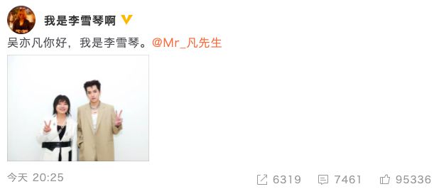 12月20日,李雪琴在微博分享了一张自己与吴亦凡的合照,说道:“吴亦凡你好,我是李雪琴。”并艾特了吴亦凡。照片中李雪琴穿着白色西装,黑色腰封搭配珍珠链条,笑容满面,吴亦凡则是驼色大衣搭配白色内搭,脖子上的粗项链十分吸睛,两个人都对着镜头可爱比耶。粉丝纷纷评论道:“羡慕!追星最大赢家!”