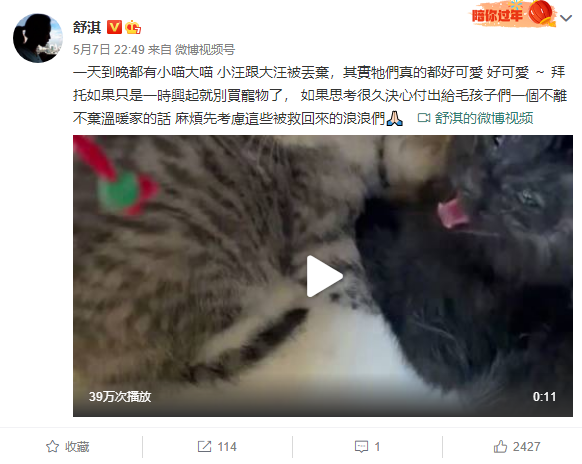 7日晚,演员舒淇在个人社交平台晒出一段小动物的视频,并发文称“ 一天到晚都有小喵大喵 小汪跟大汪被丢弃,其实他们真的都好可爱,拜托如果只是一时兴起就别买小动物了,如果思考很久决心付出给毛孩子们一个不离不弃温暖家的话,麻烦先考虑这些被救回来的浪浪们。” 真是人美心善。