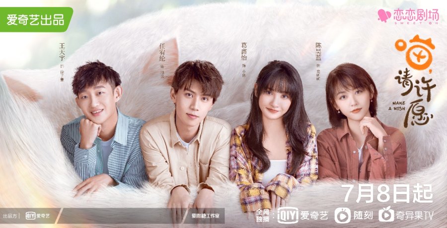 由爱奇艺出品,高朋执导,任宥纶、葛鑫怡、陈昊蓝、王天宇主演的奇喵童话《喵,请许愿》正式定档7月8日爱奇艺恋恋剧场播出,每周四至周六20点更新两集,爱奇艺VIP会员抢先看6集。7月24日会员完结,7月31日转免完结。
