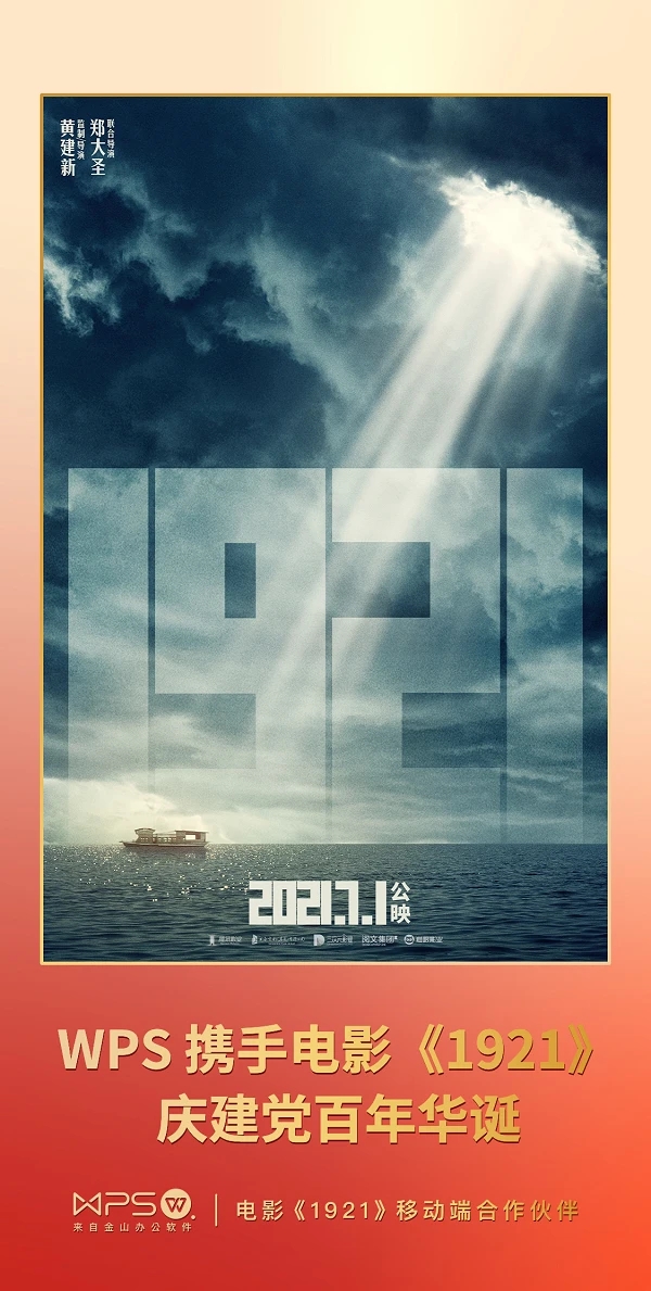 今年是中国共产党成立100周年,金山办公旗下WPS将以移动端合作伙伴的身份,携手影片《1921》共同庆祝党的百岁生日。