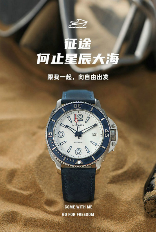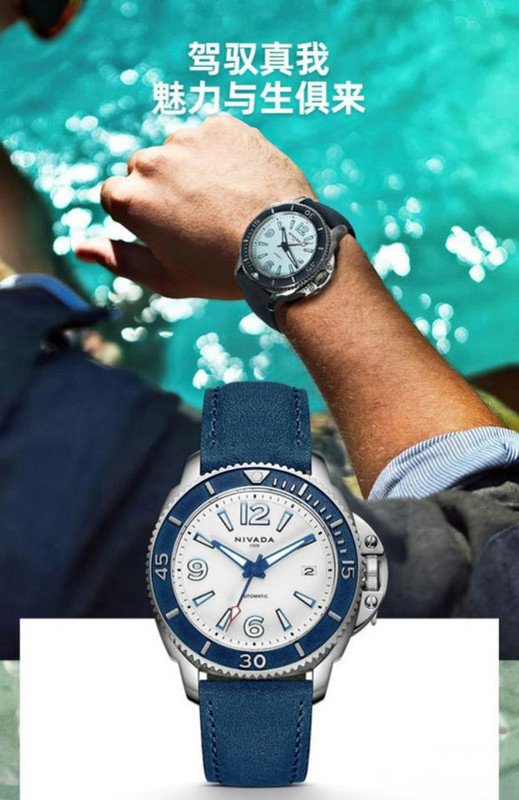 这款张欣尧佩戴的是NIVADA尼维达智达系列皮质表带白盘机械休闲时尚运动男士潜水腕表N936183136612。宝蓝与白色的搭配,宛如蔚蓝的波涛与雪白的浪花,他从海上来,浪花满袖。