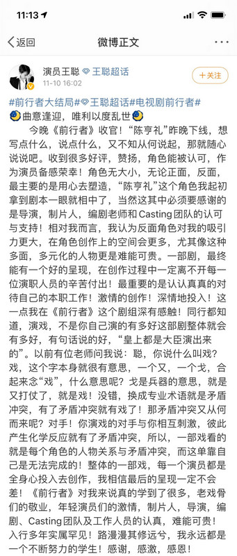 在大结局前夕,王聪的也发长微博写下了自己对《前行者》这部作品的“心路历程”,还在文中表述了自己所理解的“什么是戏?”。叙述了自己作为演员,收到好评、赞扬,以及大家对角色的认可时的深感荣幸。并且虚心地表示:“入行多年实属罕见!路漫漫其修远兮,我永远都是一个不断努力的学生!感谢,感激,感恩!”在这个“虚浮”的行业里,他让大家感受到了自己对戏剧的真诚,对角色的专注,对演员这个职业的热爱。演员王聪一直潜心创作着每一个人物角色,专注自己的演技,他在用实力来向我们表达“演员的自我修养”。