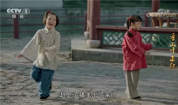 甚至在第9集,还安排了两个小女孩在香山边玩边唱《拥军花鼓》的场景,孩童真挚、清脆的歌声成功吸引了屋内毛主席的注意……