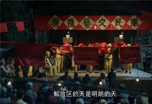 首先是红色歌曲的多次运用。电视剧第1集就是以一段军民文艺汇演作为开场戏,一群穿着黄色军衣的女兵们在舞台上欢快地唱着《解放区的天》,瞬间将观众拉进了那个火热的革命年代。