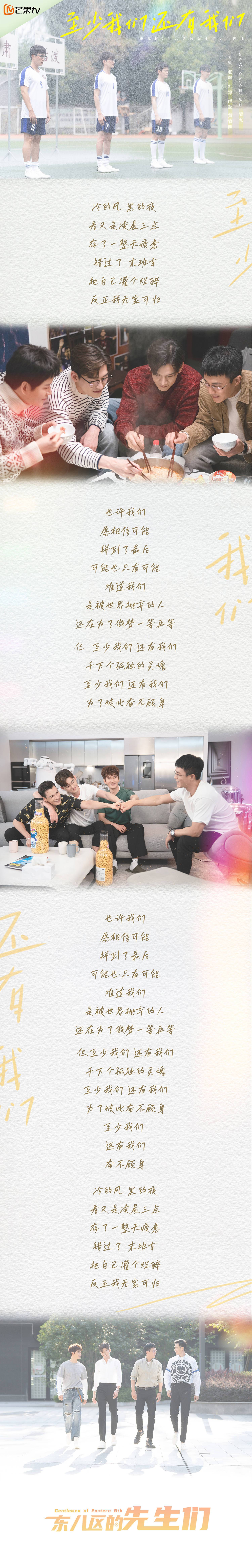 定档当天,《东八区的先生们》主题曲MV《至少我们还有我们》也同时上线。剧中童语、郭崇、向小飞、李杰森四个人在大学组乐队时共同创作了这首歌,它不仅承载了美好的大学时光,也成为了他们人生的主题曲。MV中他们一路从雨中奔跑的青葱少年变成了西装革履的成熟大人,他们之间的情感正如歌词中唱的“至少我们还有我们,为了彼此奋不顾身”。